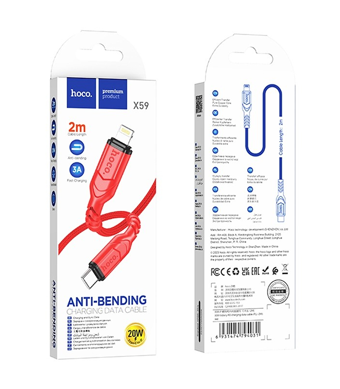 HOCO CABLE TYPE C TO LIGHTNING 8-PIN PD 20W X59 2m red