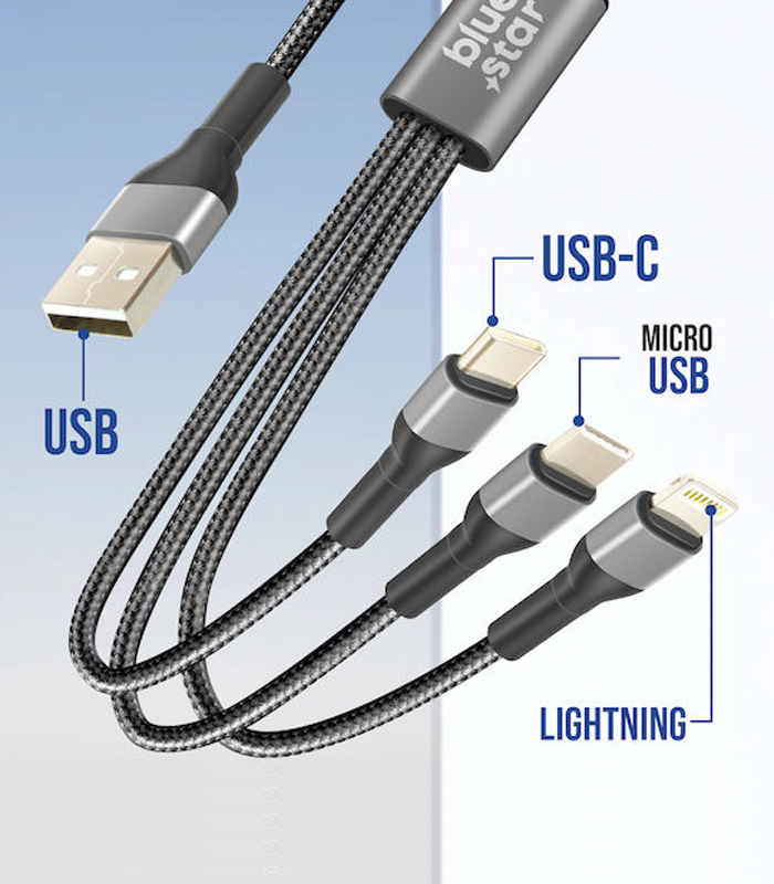 Καλώδιο φόρτισης & μεταφοράς δεδομένων Blue Star 3 σε 1 (USB-A σε Lightning / Micro-USB / USB-C) – Μαύρο
