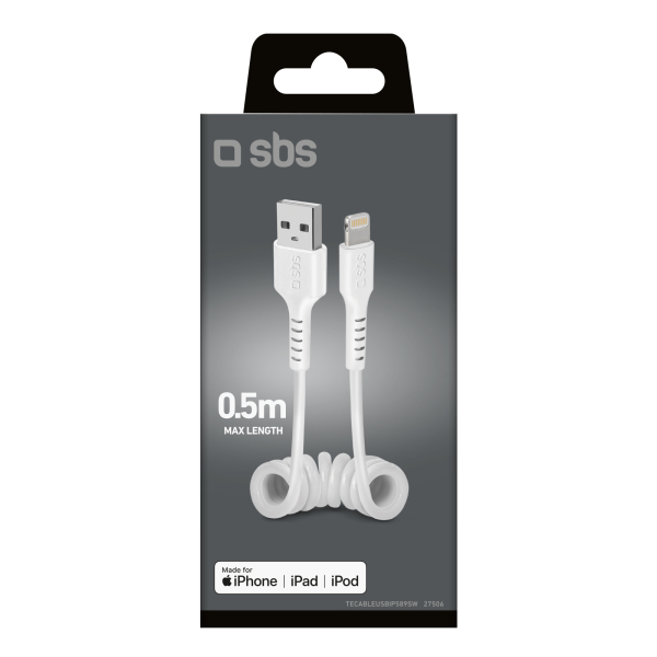 This coiled cable has USB and Lightning connectors. Connect it to a power